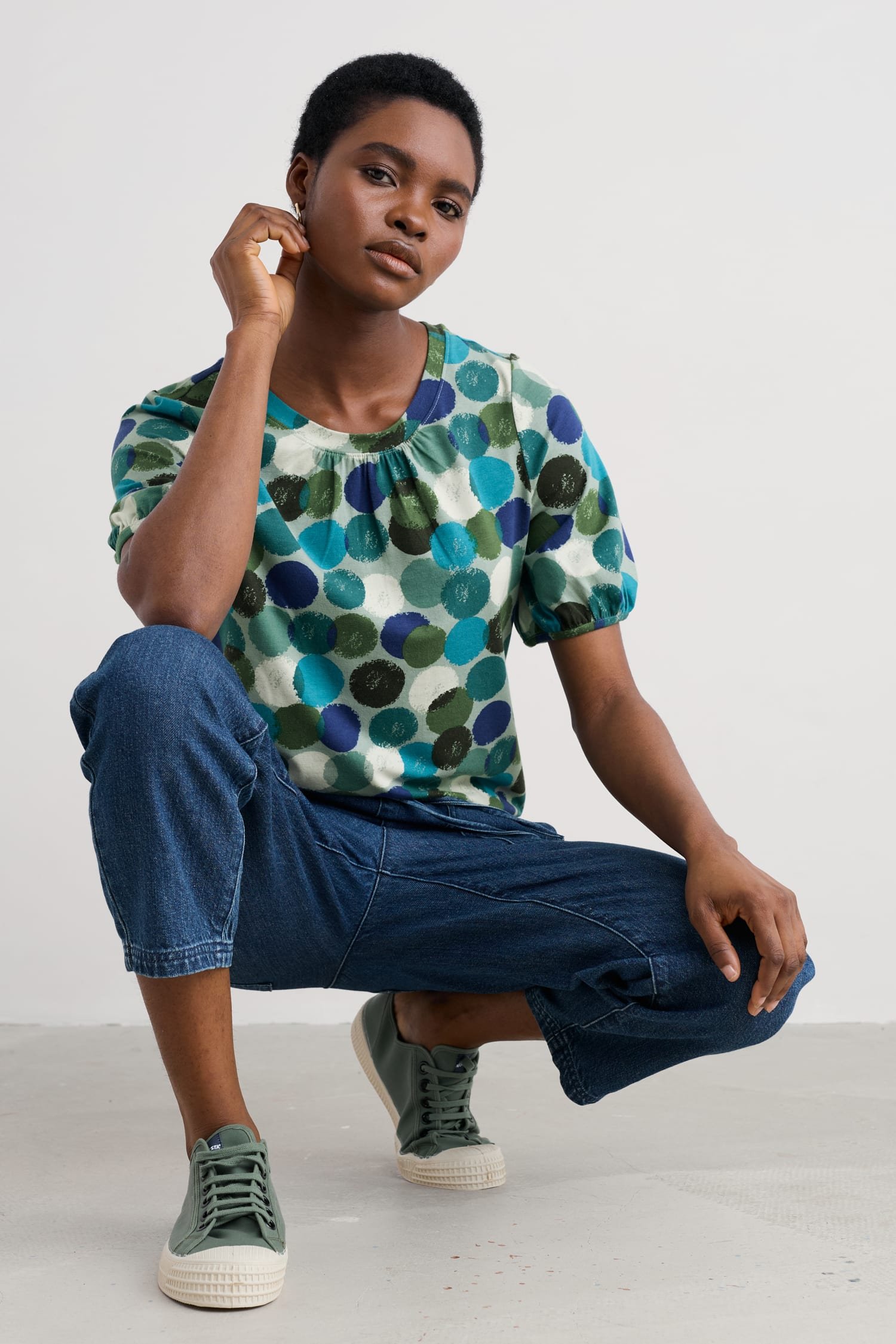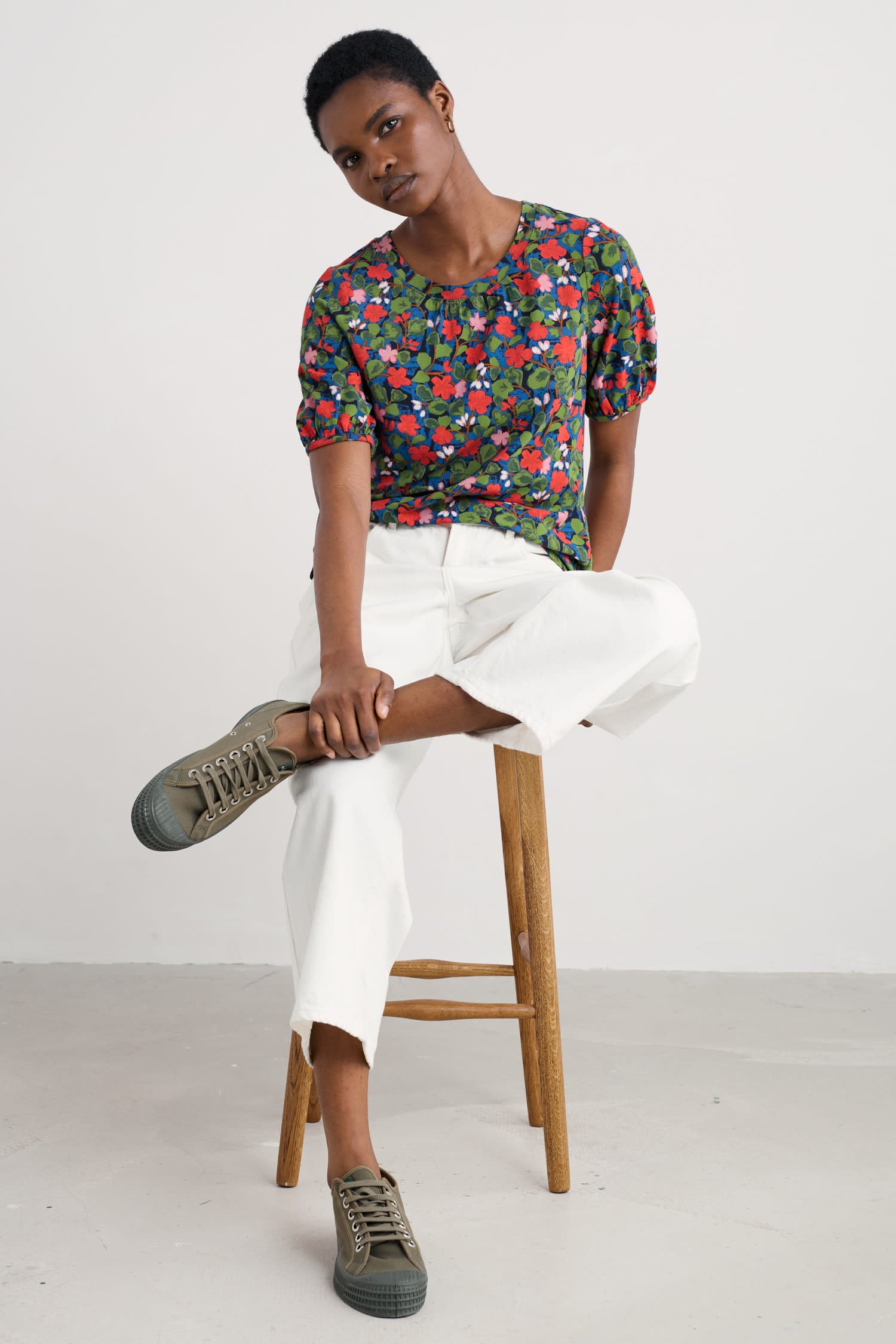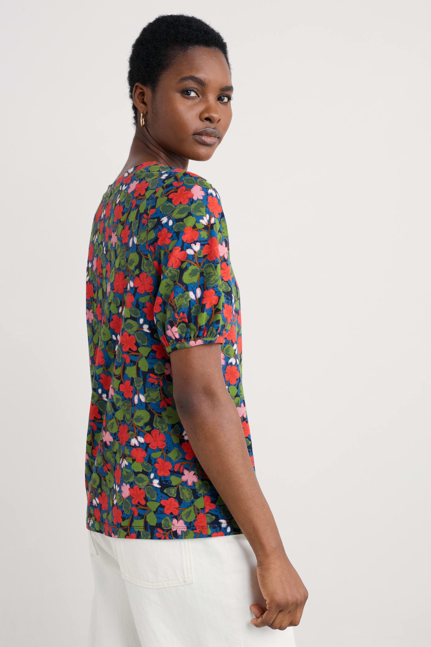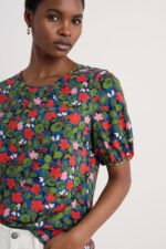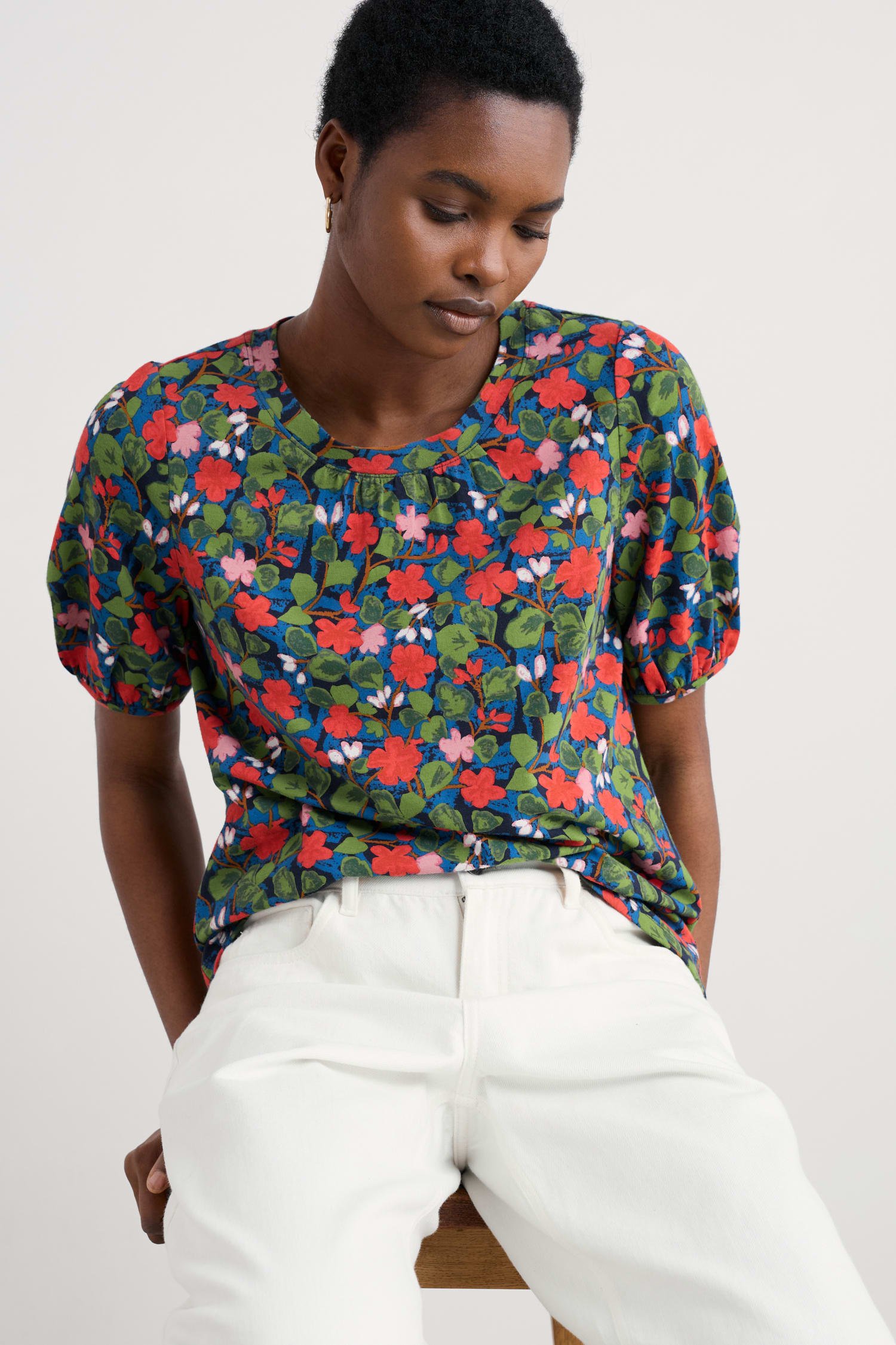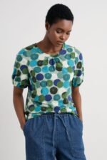 Made from an organic cotton and modal blend jersey, the Seaberry Top has a soft and smooth texture. We?ve added subtle gathers underneath the crew neck which help the top to flow naturally as you move. The short sleeves are slightly puffed, with additional gathers at the cuff that create a more delicate silhouette. Style with jeans, or layer under a knitted vest.