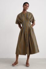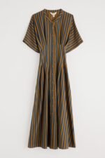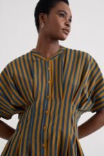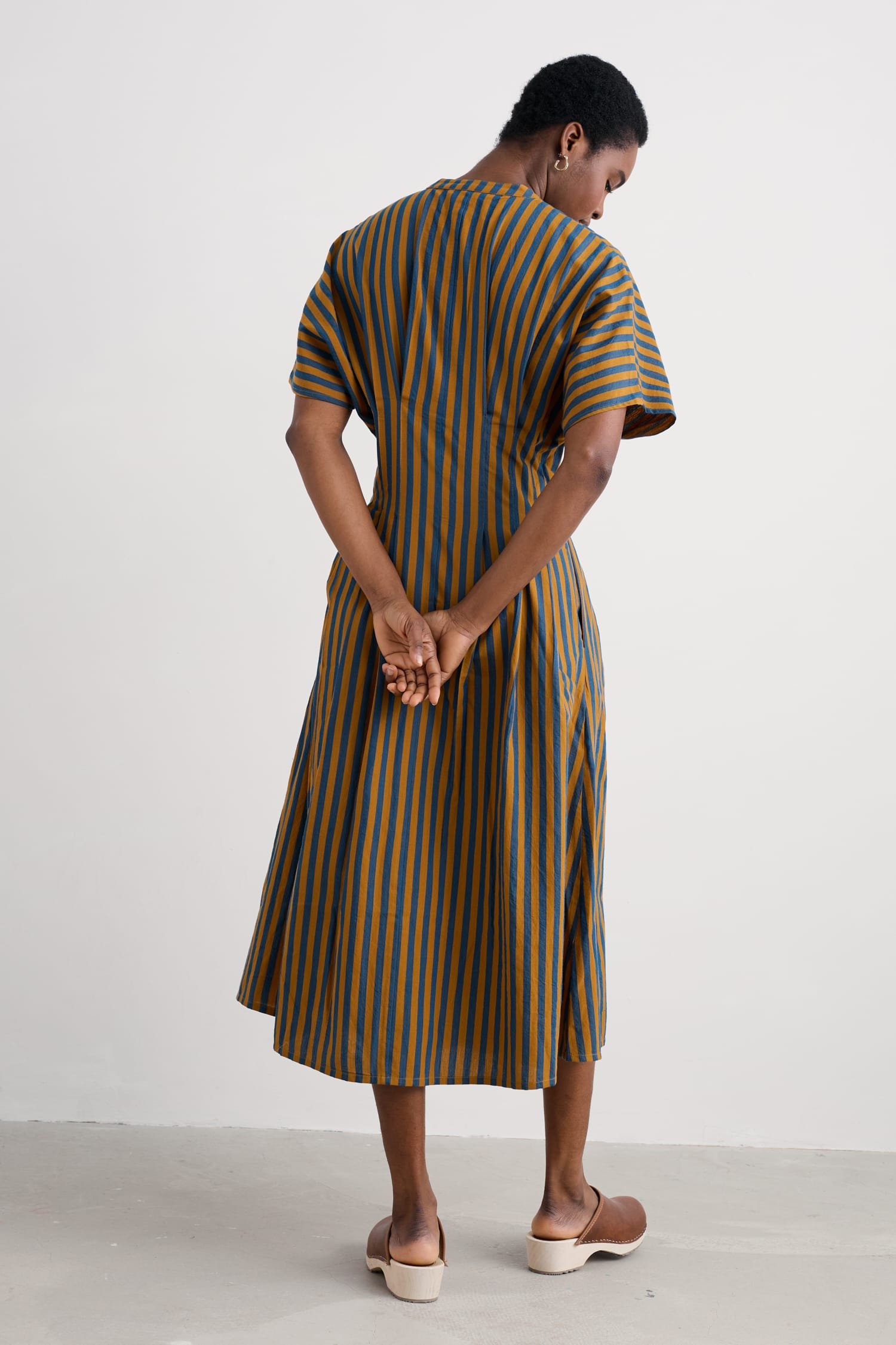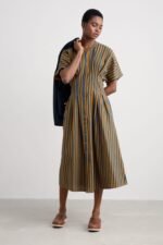 A waisted, shirt-style midi dress with a contemporary silhouette. We’ve given the button-through Lamorna a relaxed fit at the shoulders, with a round scoop neck and short angel sleeves. Pleats bring the dress in at the waist, which then flares out again into the full and floaty skirt. The result is a structural and flattering shape that’s easy to wear and style. Completed with pockets.