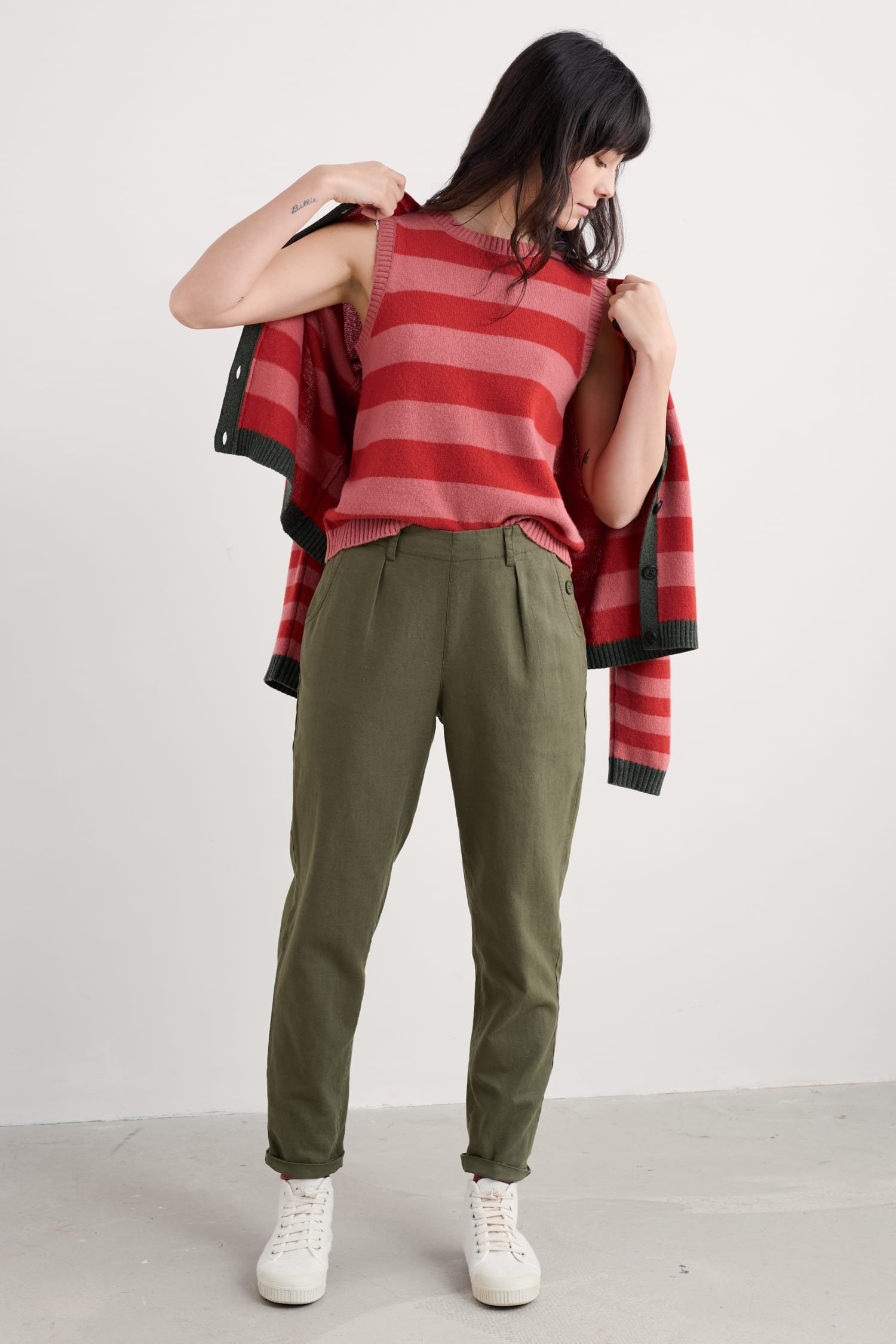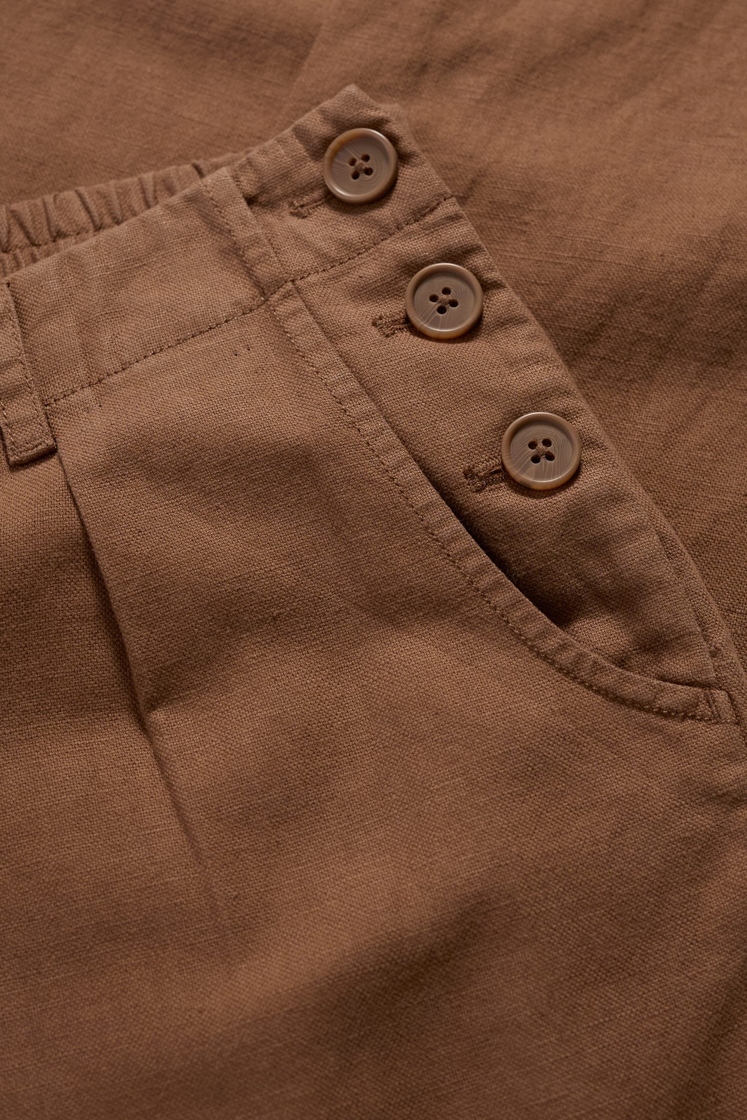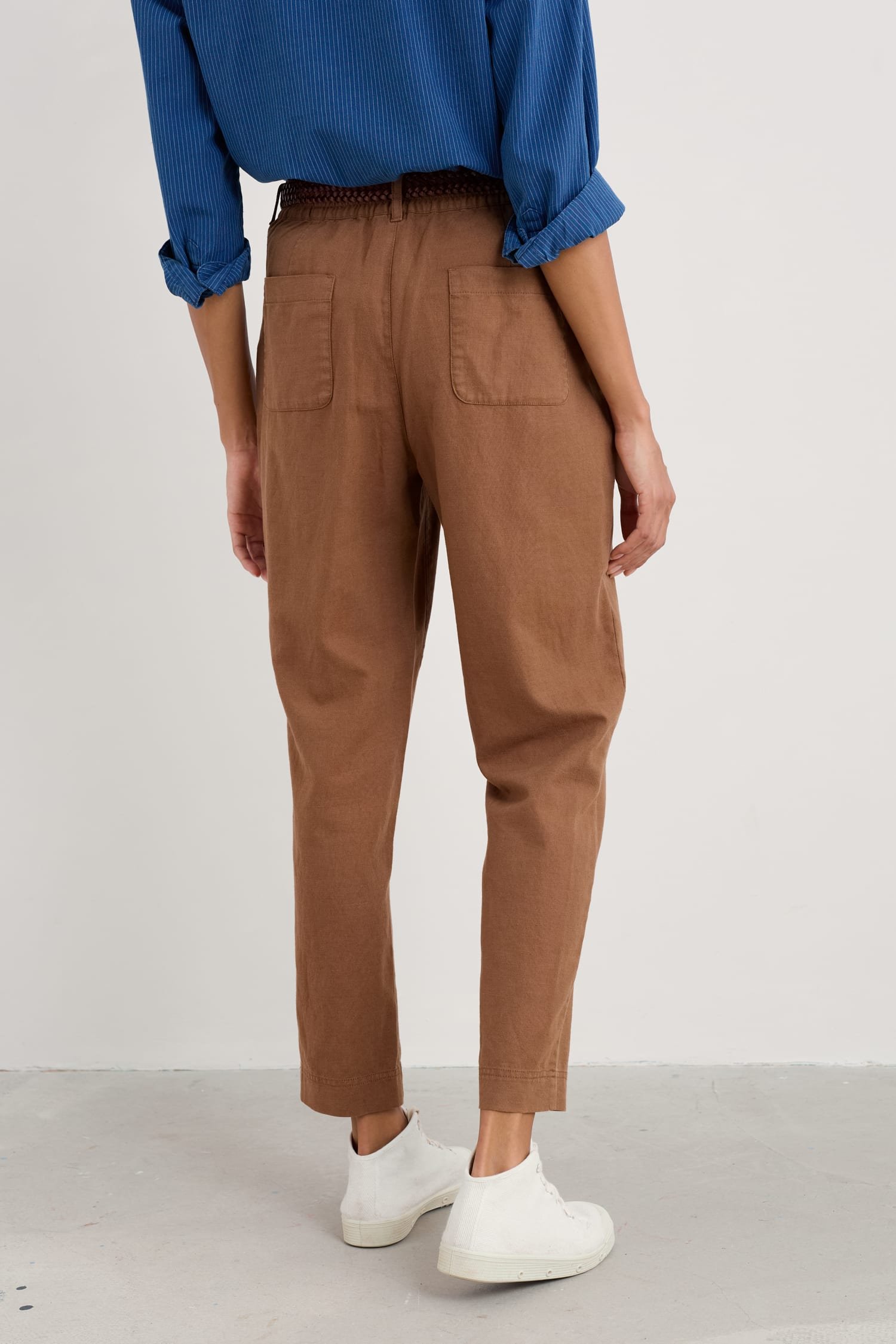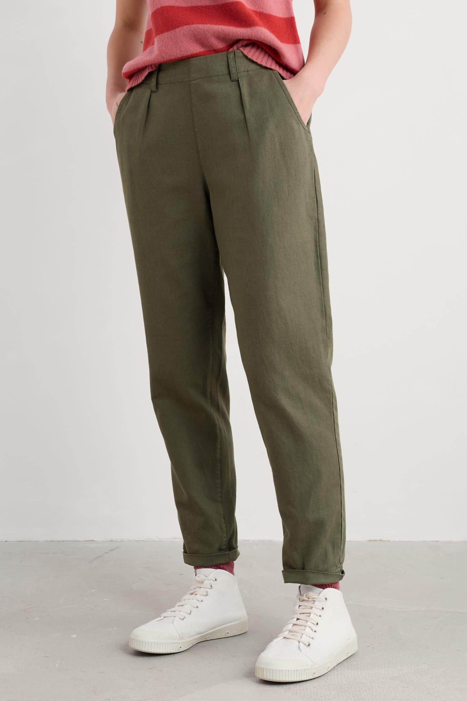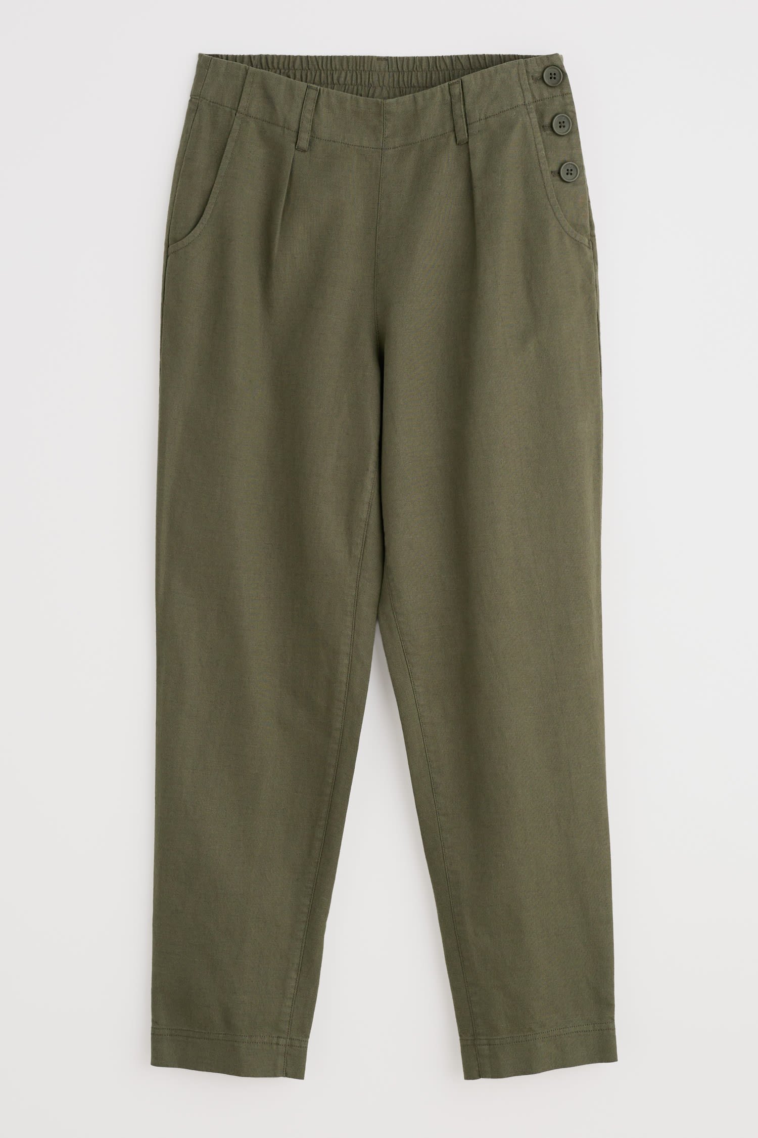 Add a dash of nautical style to your wardrobe with our Nanterrow Trousers. They have a flattering, relaxed tapered shape with functioning buttons on one side. Garment-dyed for a rich, deep hue, these versatile 7/8 length, flat-fronted trousers look equally good with Breton stripes or one of our unique prints. They sit just below the natural waist and we’ve given them an elasticated back waist for an extra comfy fit. Two handy side pockets and two back pockets add the finishing touches. Perfect with a pair of colourful flats or trainers for a more casual look.