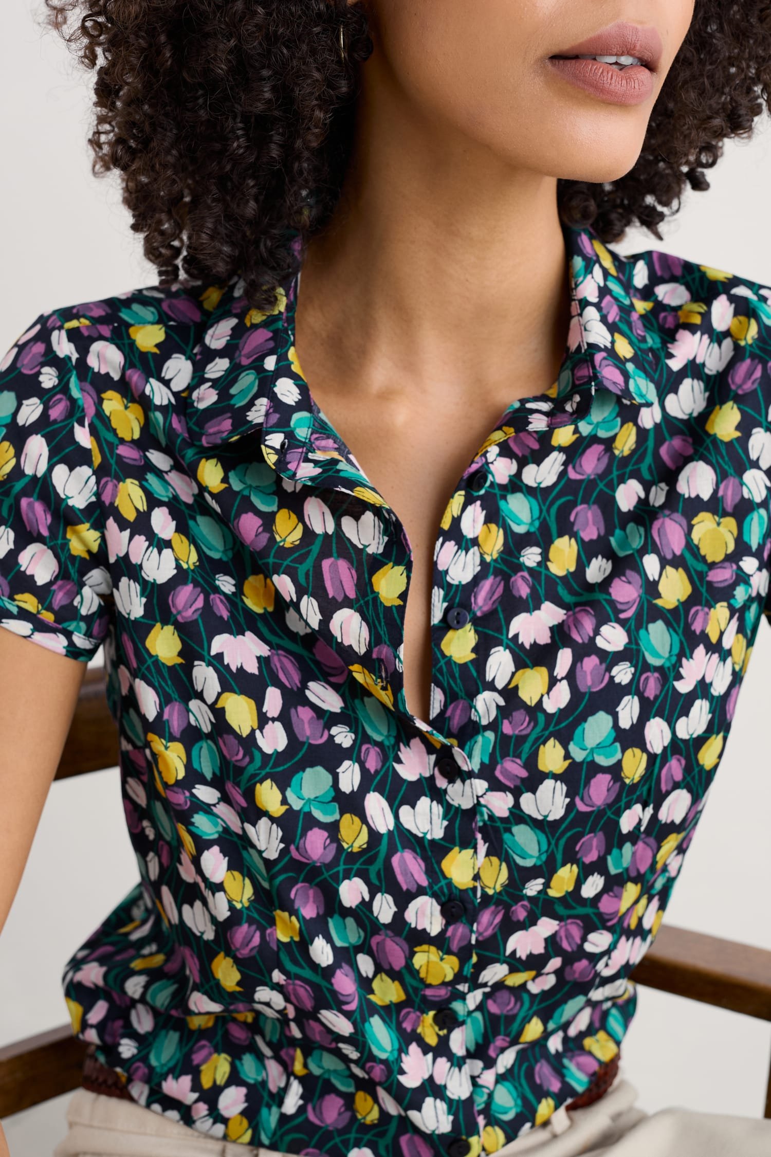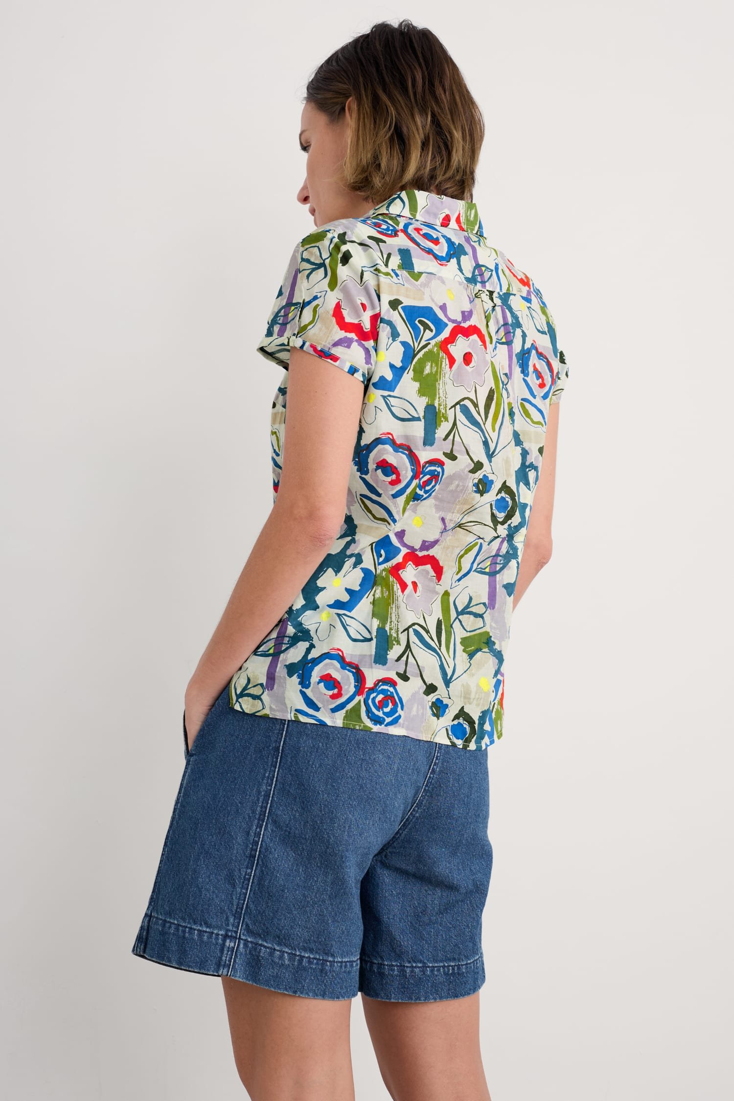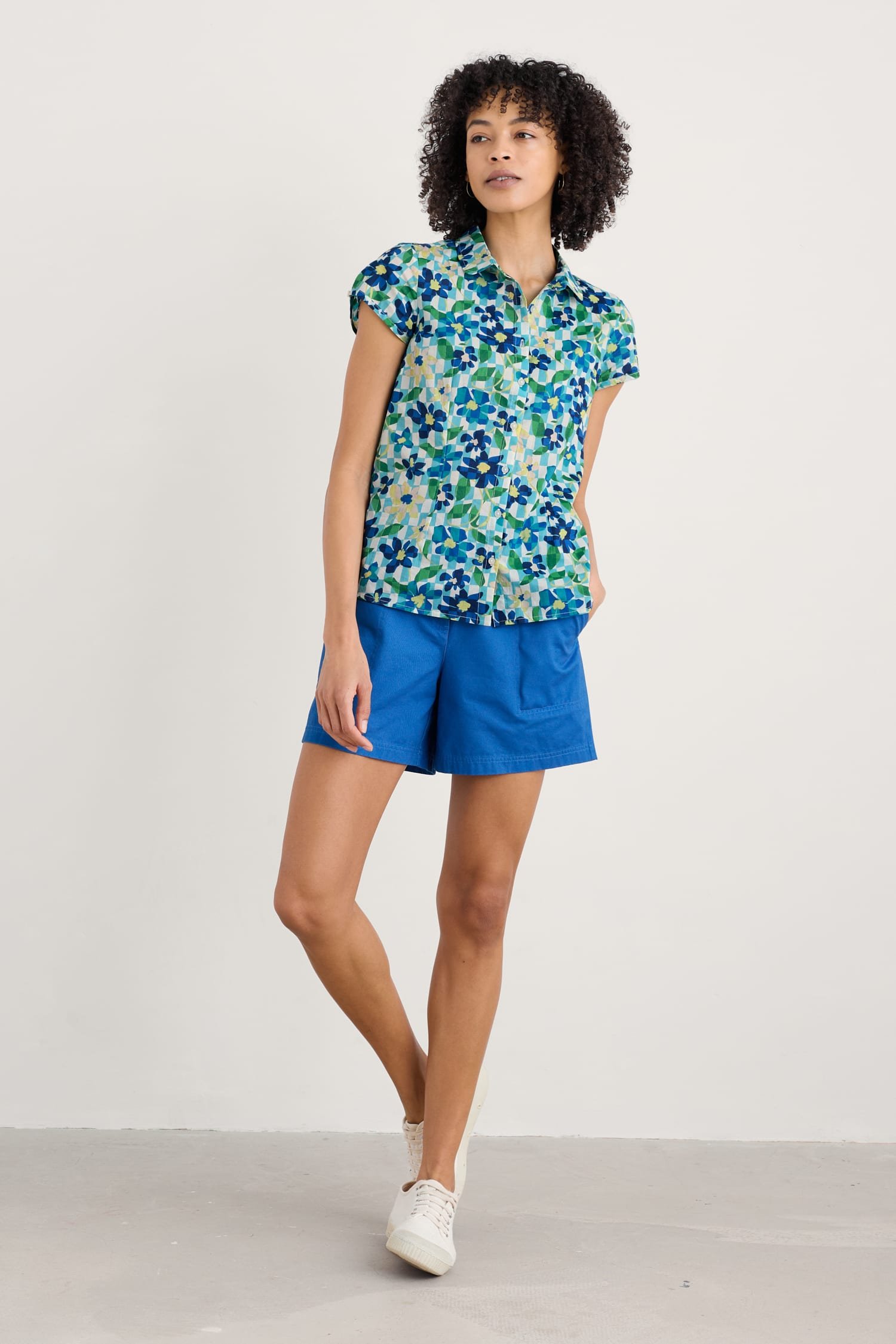 A pretty summer shirt in a unique Seasalt print, inspired by Cornwall. Our Rushmaker Shirt is a more structured way to wear our prints. This semi-fitted style is made from airy cotton voile, with a rounded collar and cap sleeves with sweet keyhole details. We love it with crops or loose linen trousers and flat leather sandals.