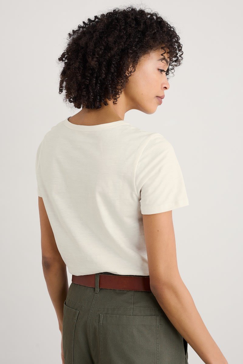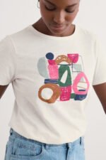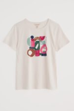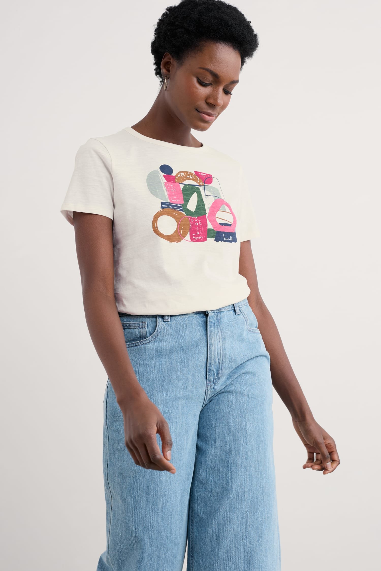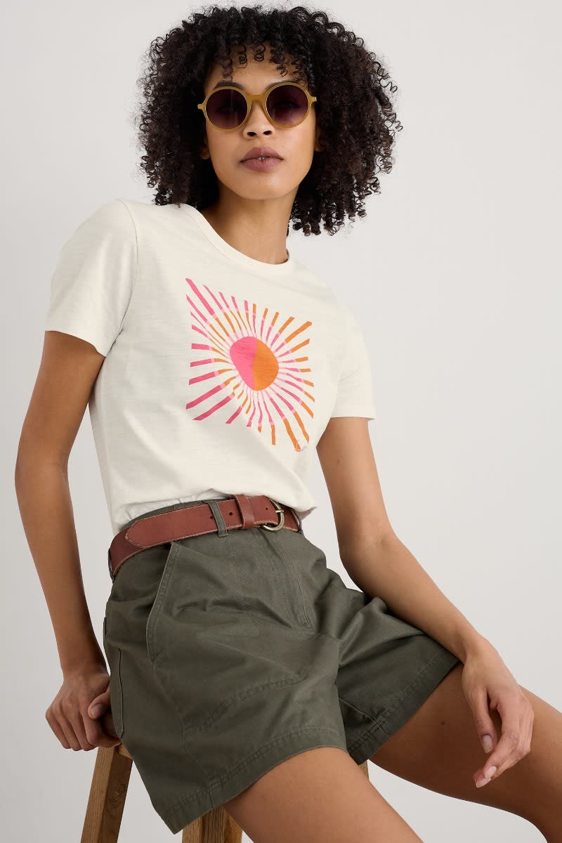 A graphic T-shirt inspired by our summer on the Isles of Scilly. This short-sleeved top is made from soft organic cotton with an abstract design depicting waves and the island sunshine. We love it with wide leg culottes, leather sandals and a rustic basket bag.