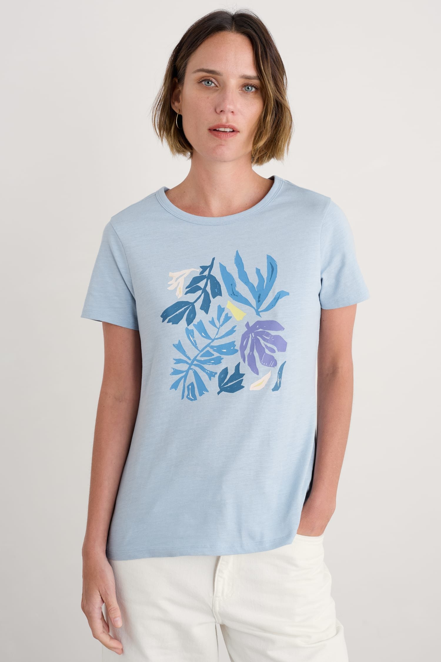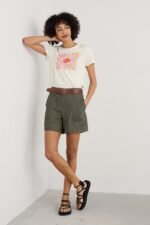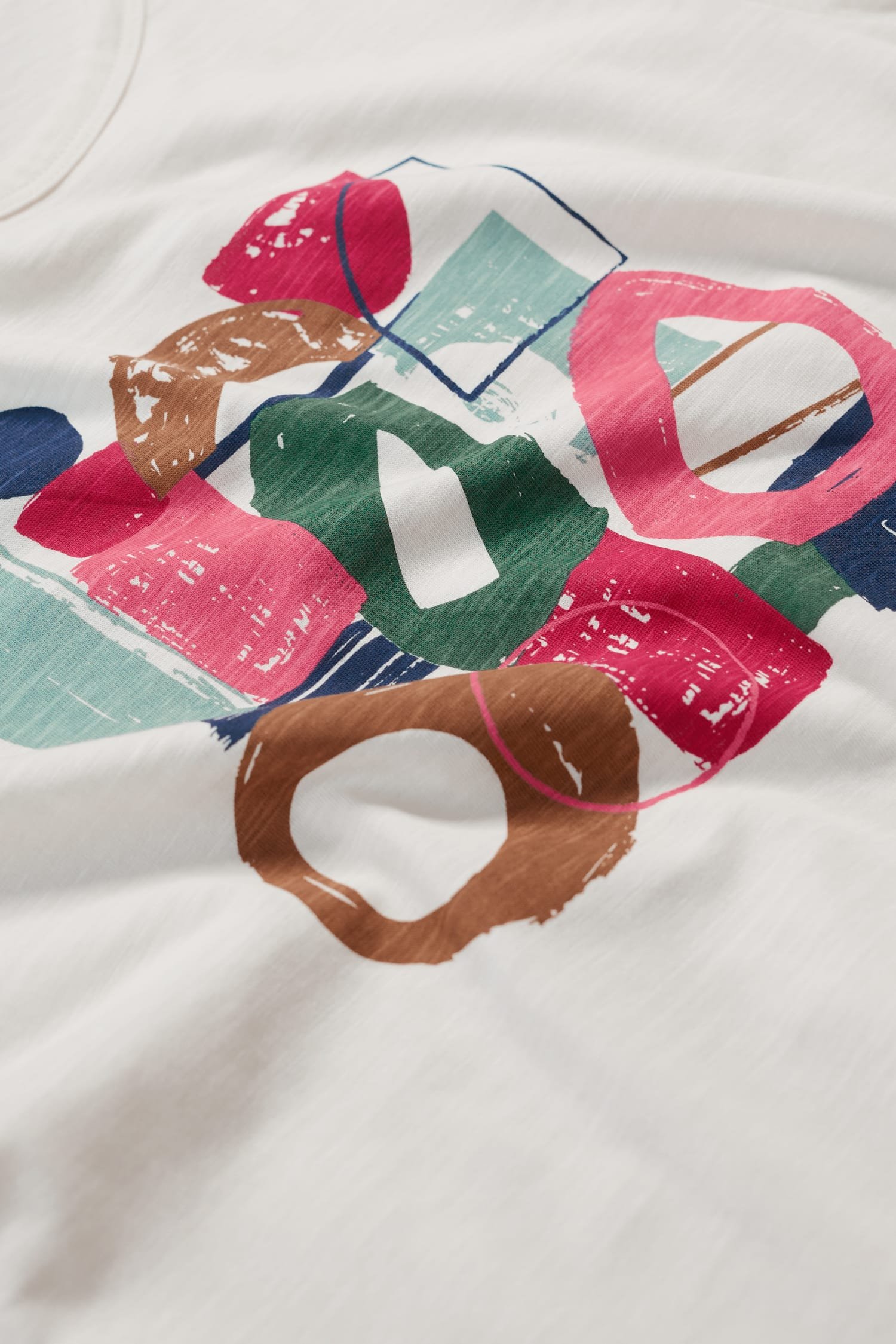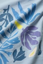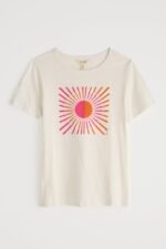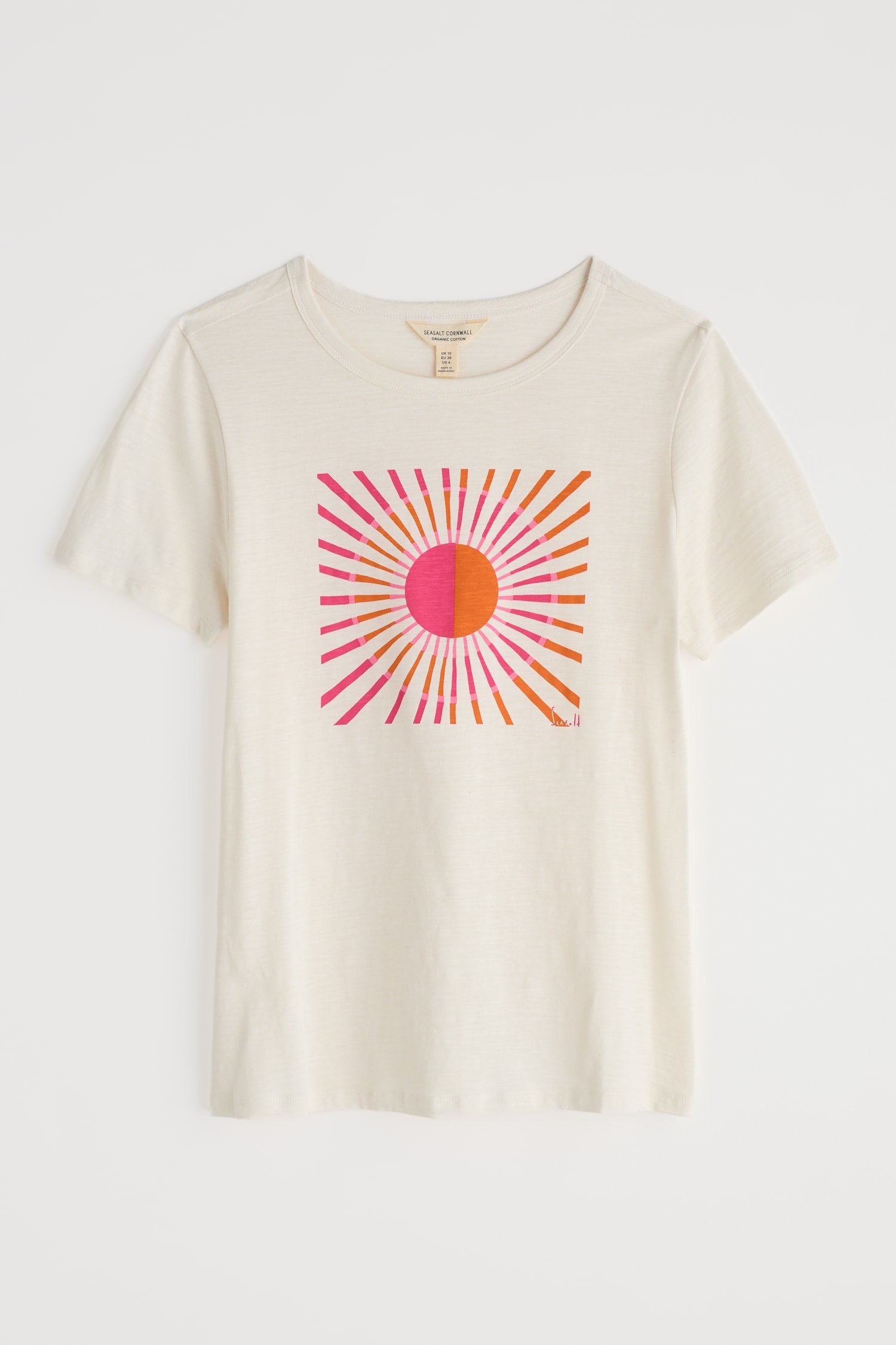 A graphic T-shirt inspired by our summer on the Isles of Scilly. This short-sleeved top is made from soft organic cotton with an abstract design depicting waves and the island sunshine. We love it with wide leg culottes, leather sandals and a rustic basket bag.