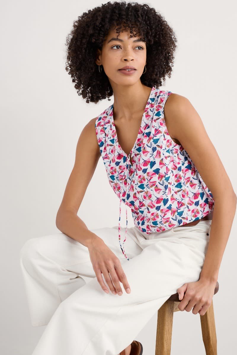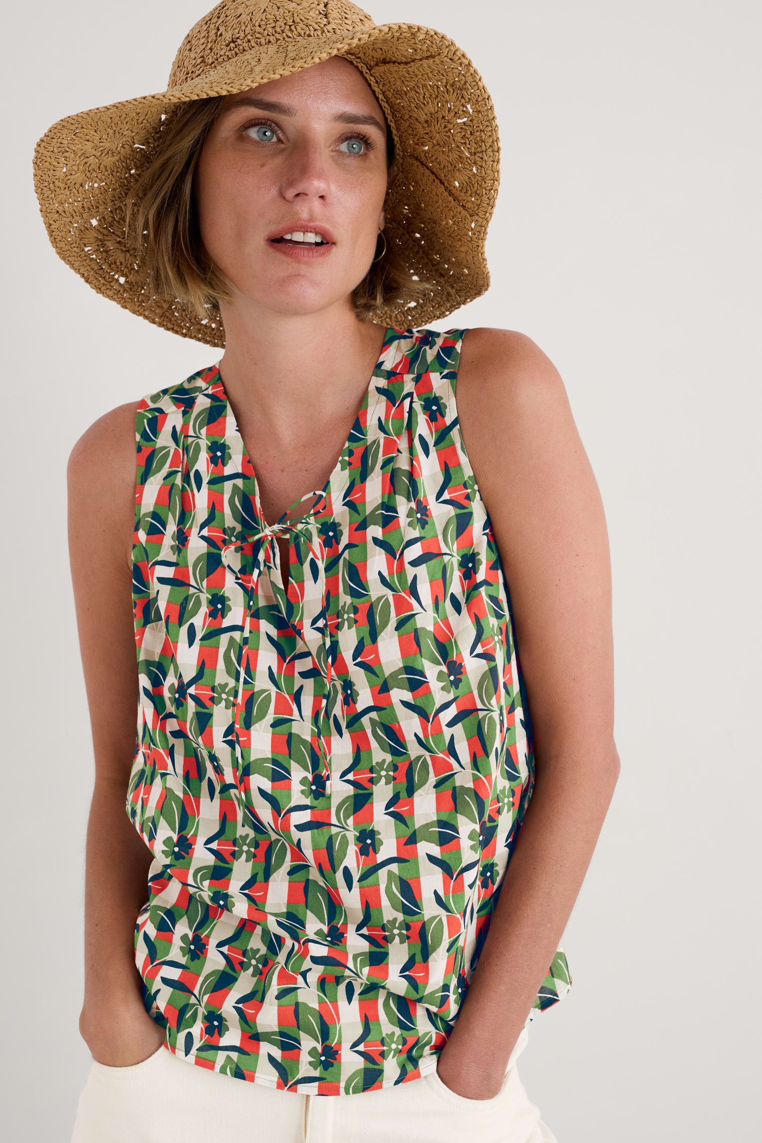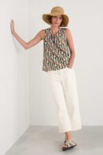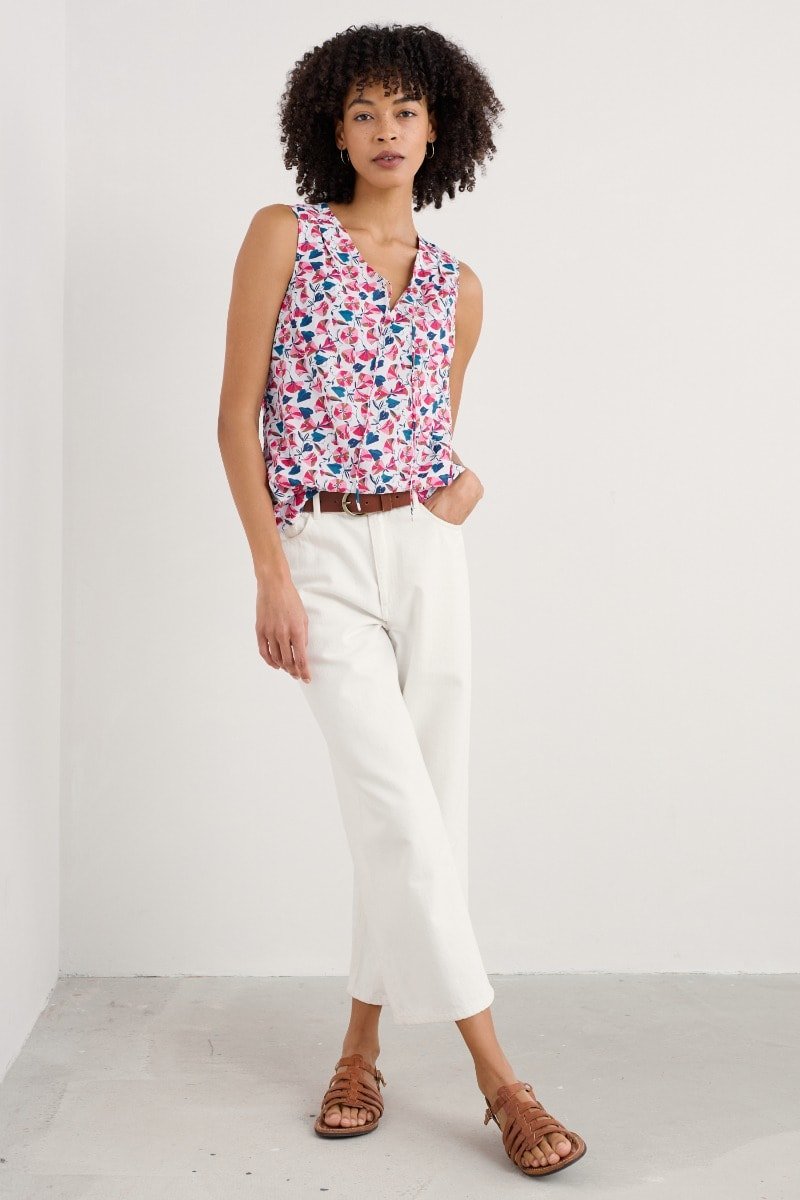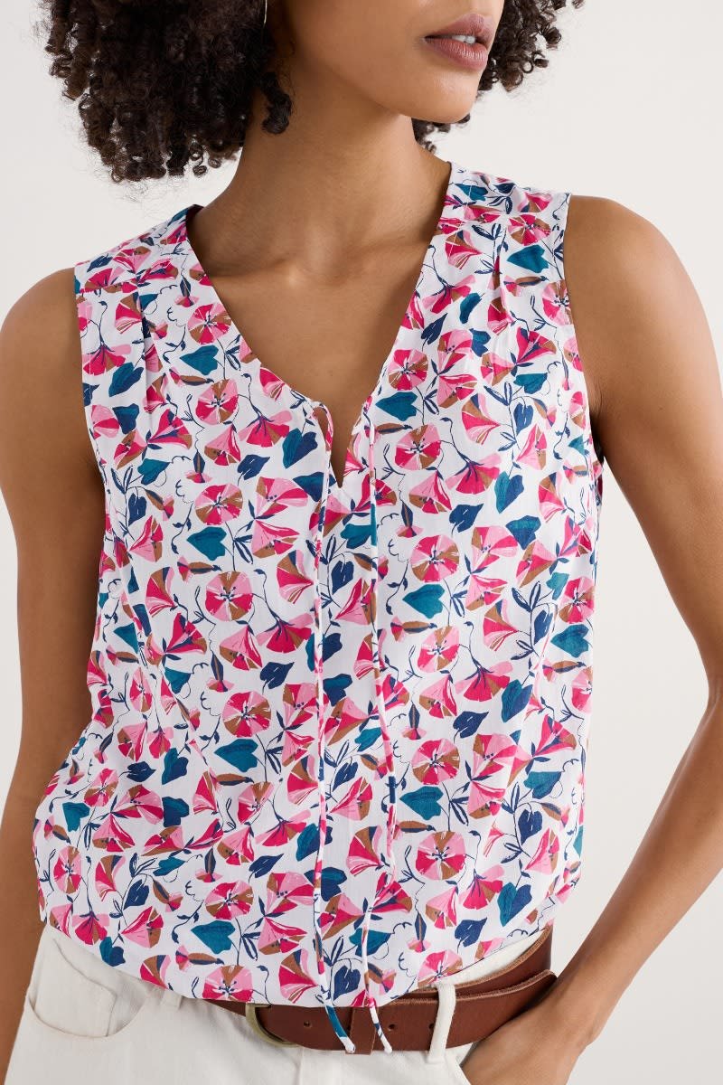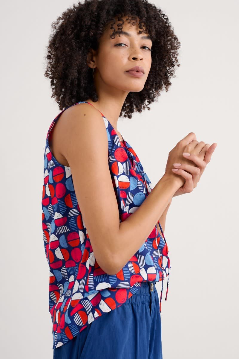 A cool and airy sleeveless top in a fresh Seasalt print. Our Cobbs Well Top has a pretty V-neck with keyhole detail and fine rouleau ties. Team it with linen crops and colourful flat leather sandals for effortless summer style.