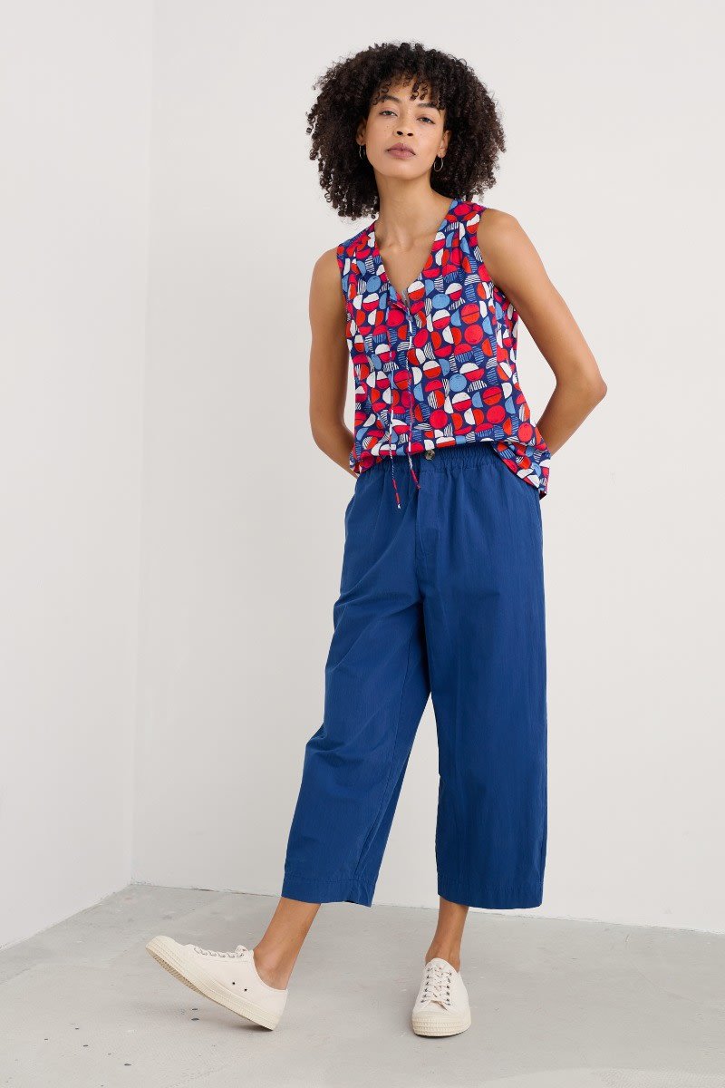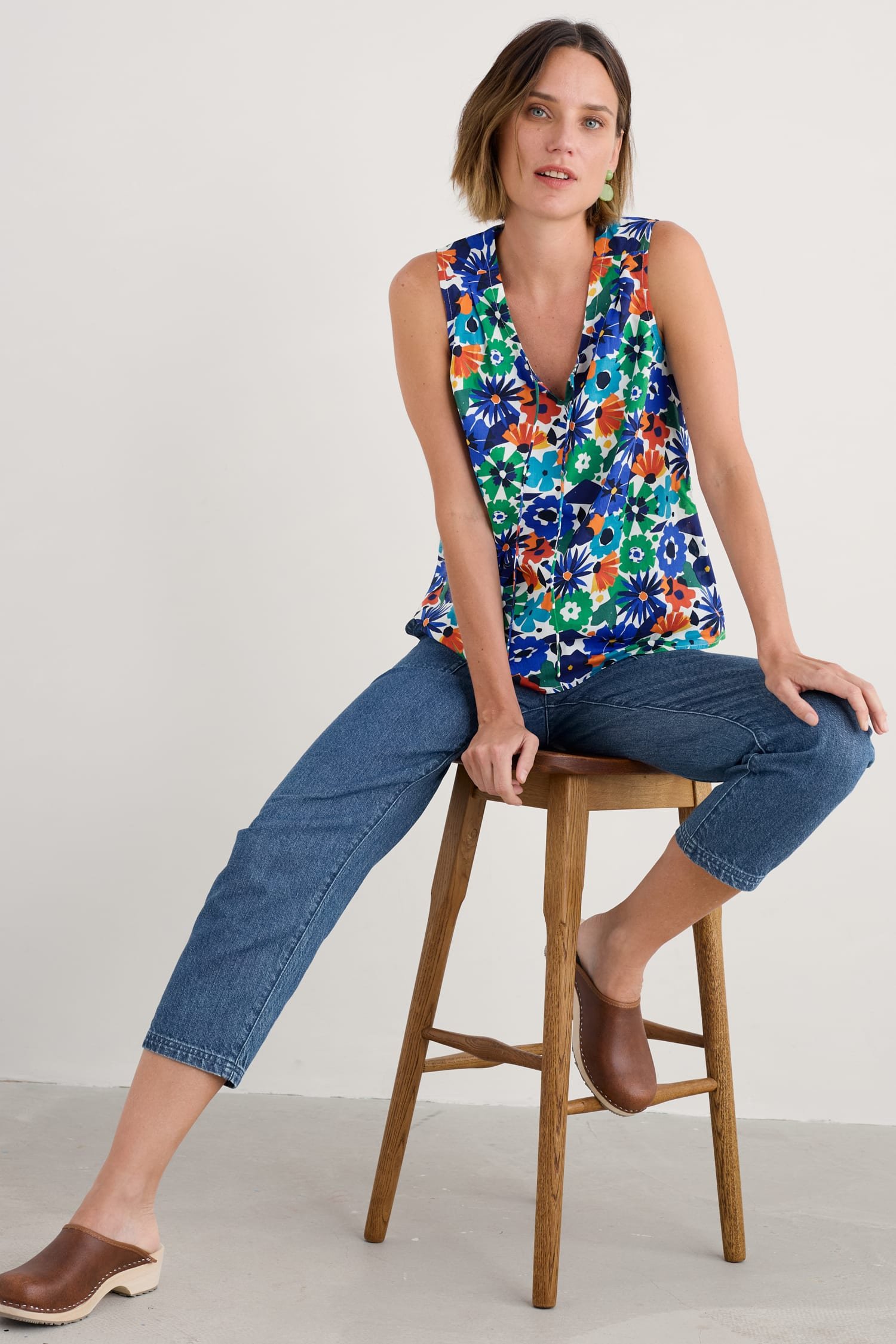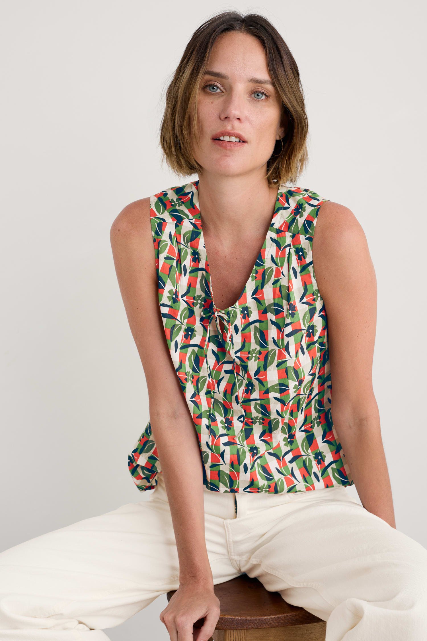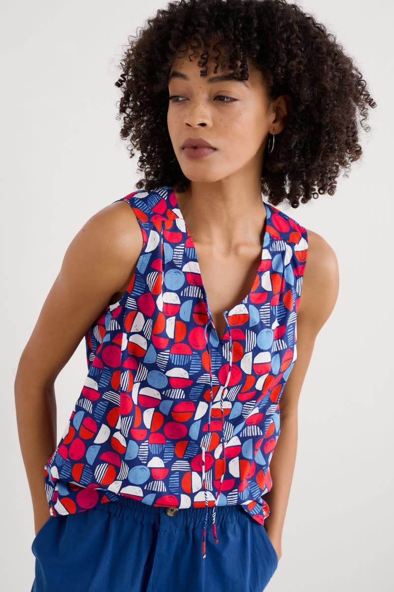 A cool and airy sleeveless top in a fresh Seasalt print. Our Cobbs Well Top has a pretty V-neck with keyhole detail and fine rouleau ties. Team it with linen crops and colourful flat leather sandals for effortless summer style.