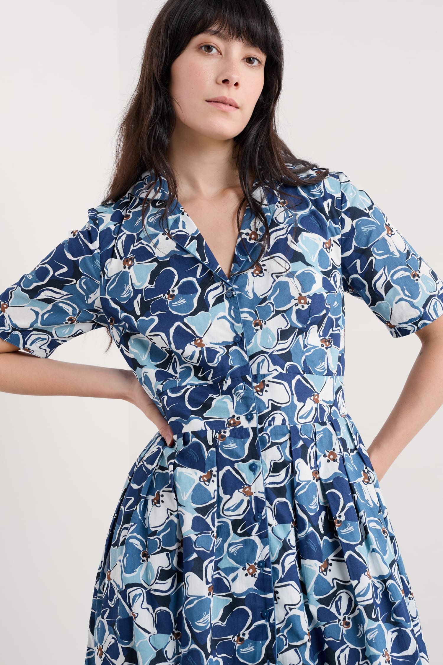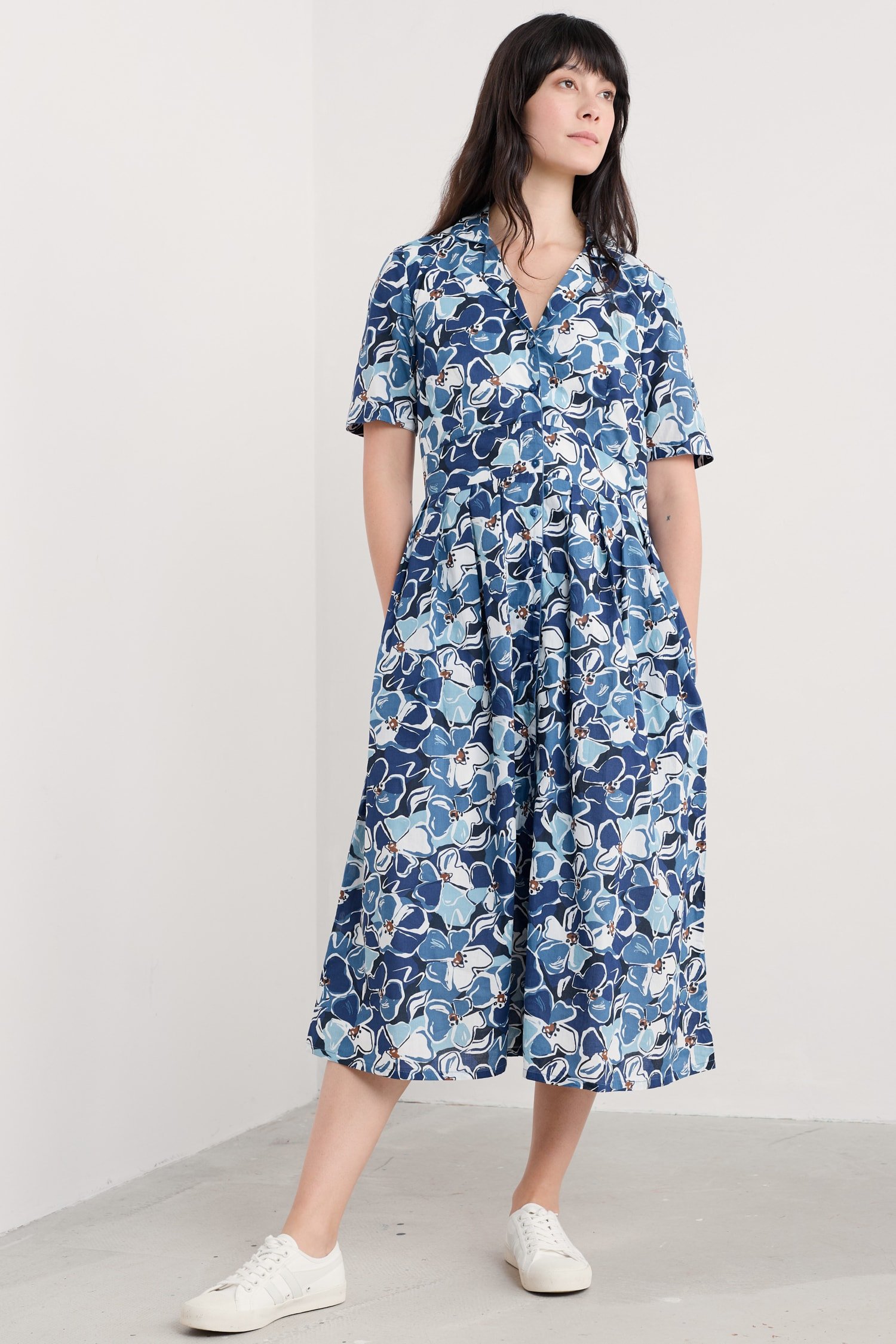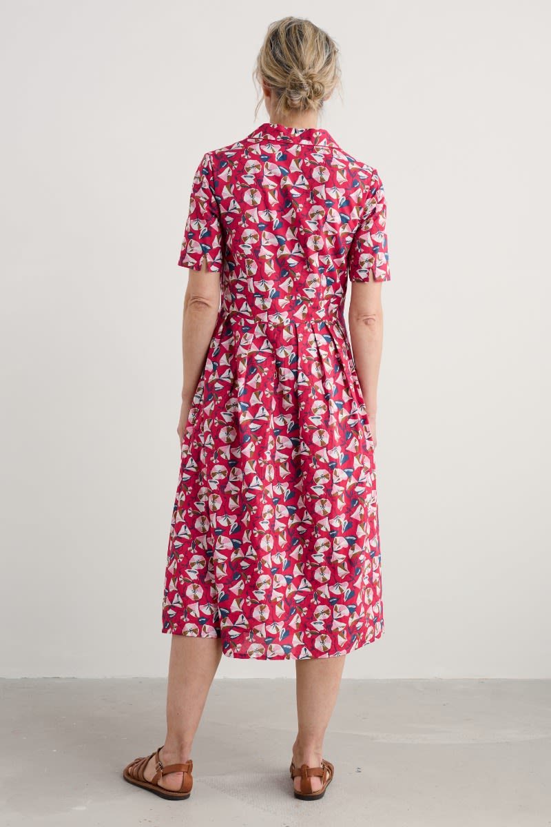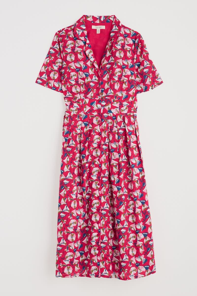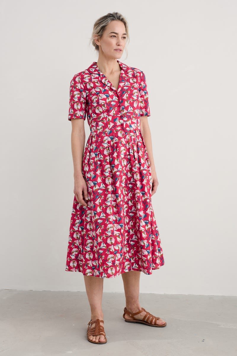A midi-length shirt dress with an elegant vintage feel. Our Charlotte Dress is based on our best-selling Lottie, with a lower hem and half sleeves. Inspired by tea dresses from the forties and fifties, it’s made from soft cotton voile with a full skirt and buttons right through the front. It’s finished with piped trims, relaxed in seam pockets and a bold floral Seasalt print.