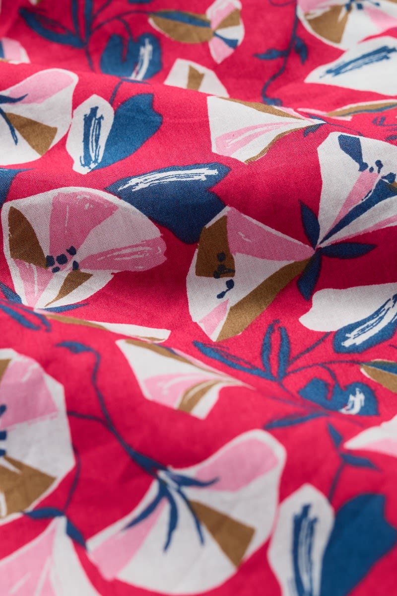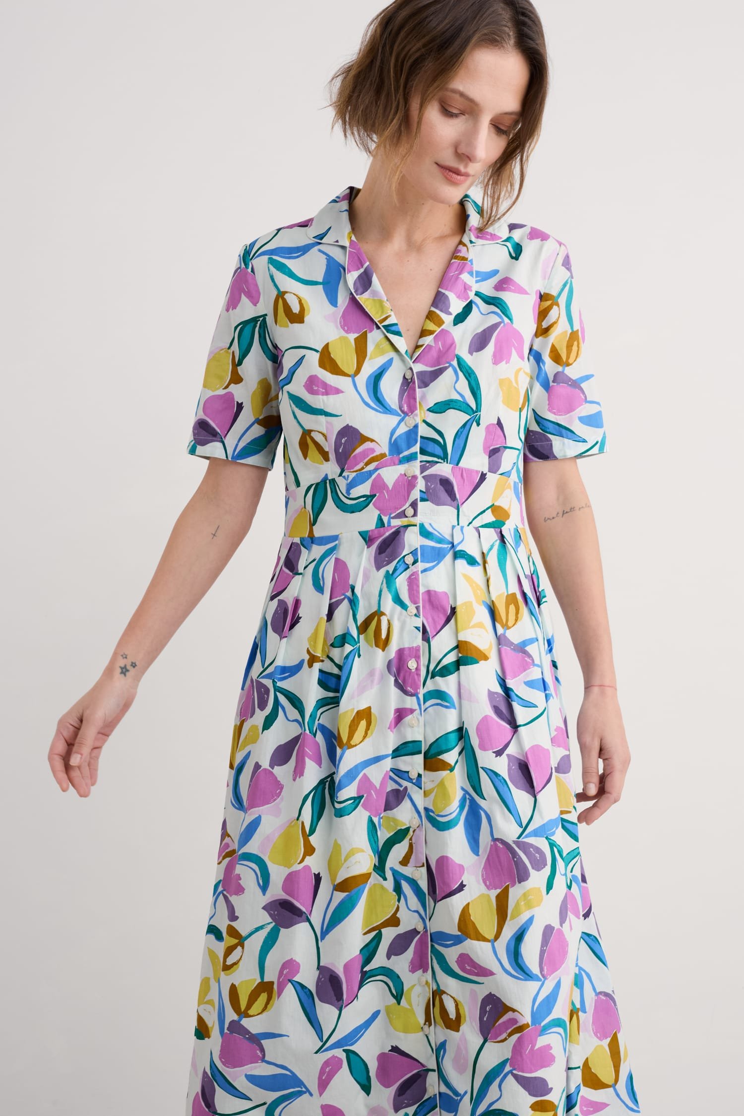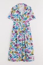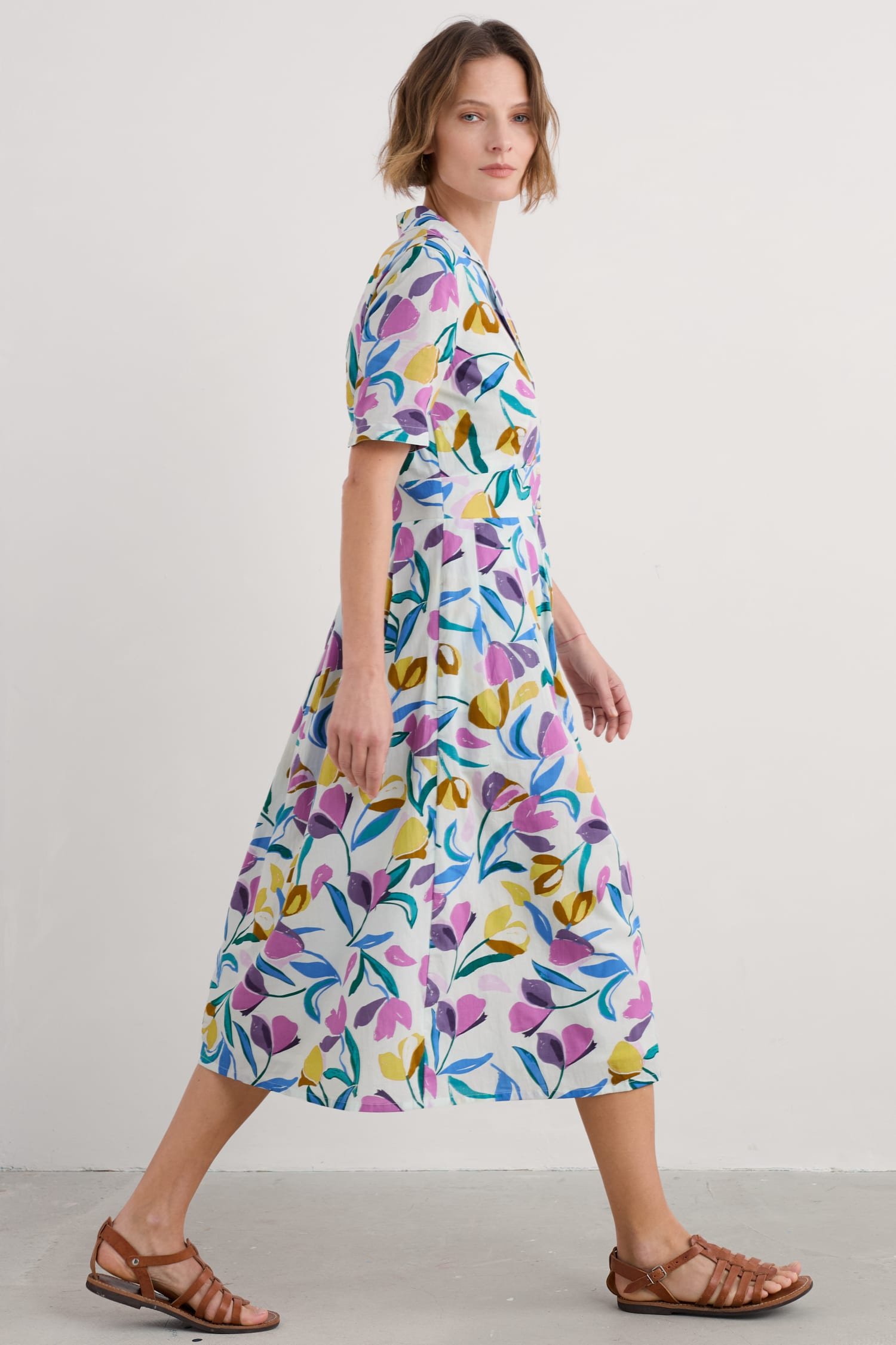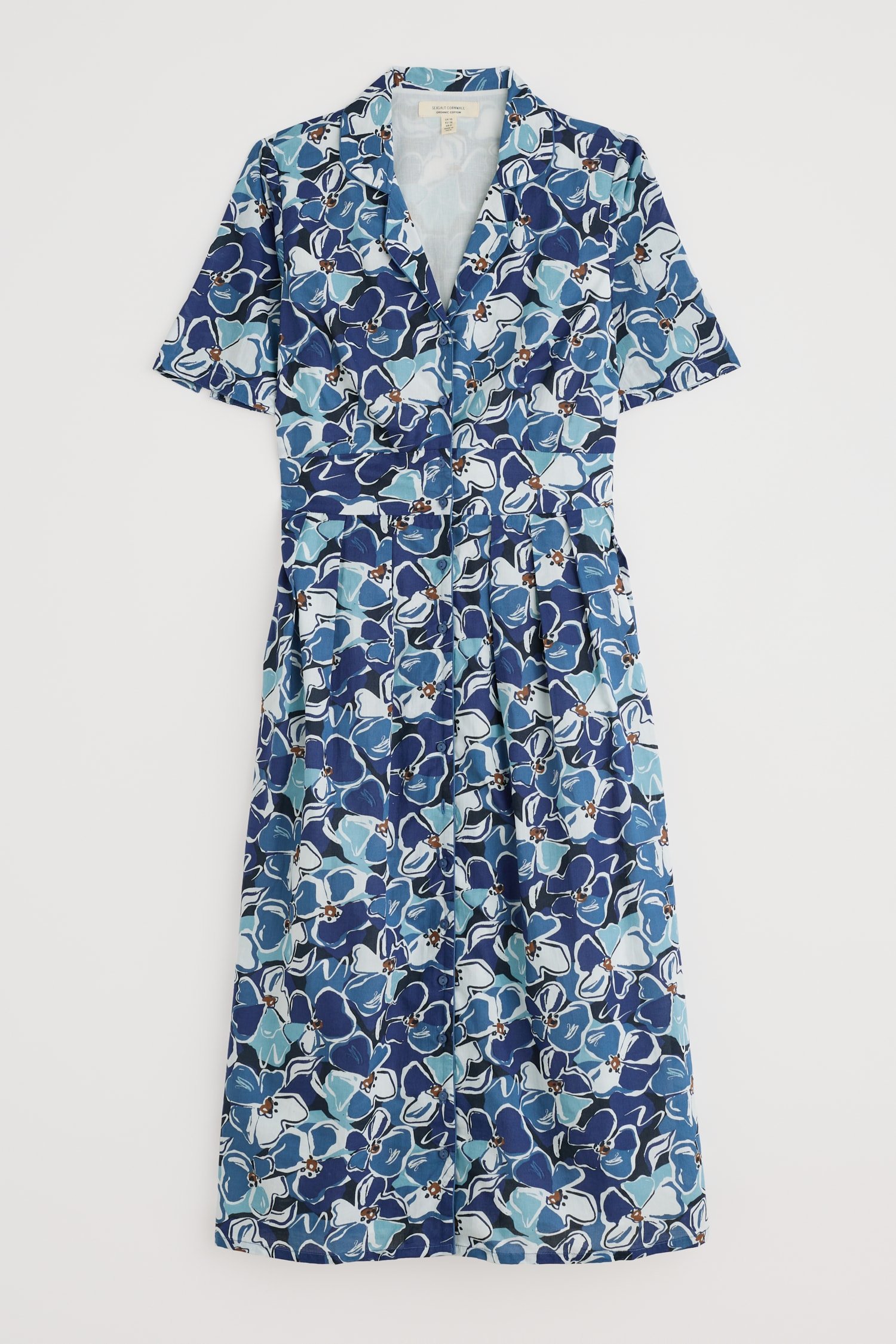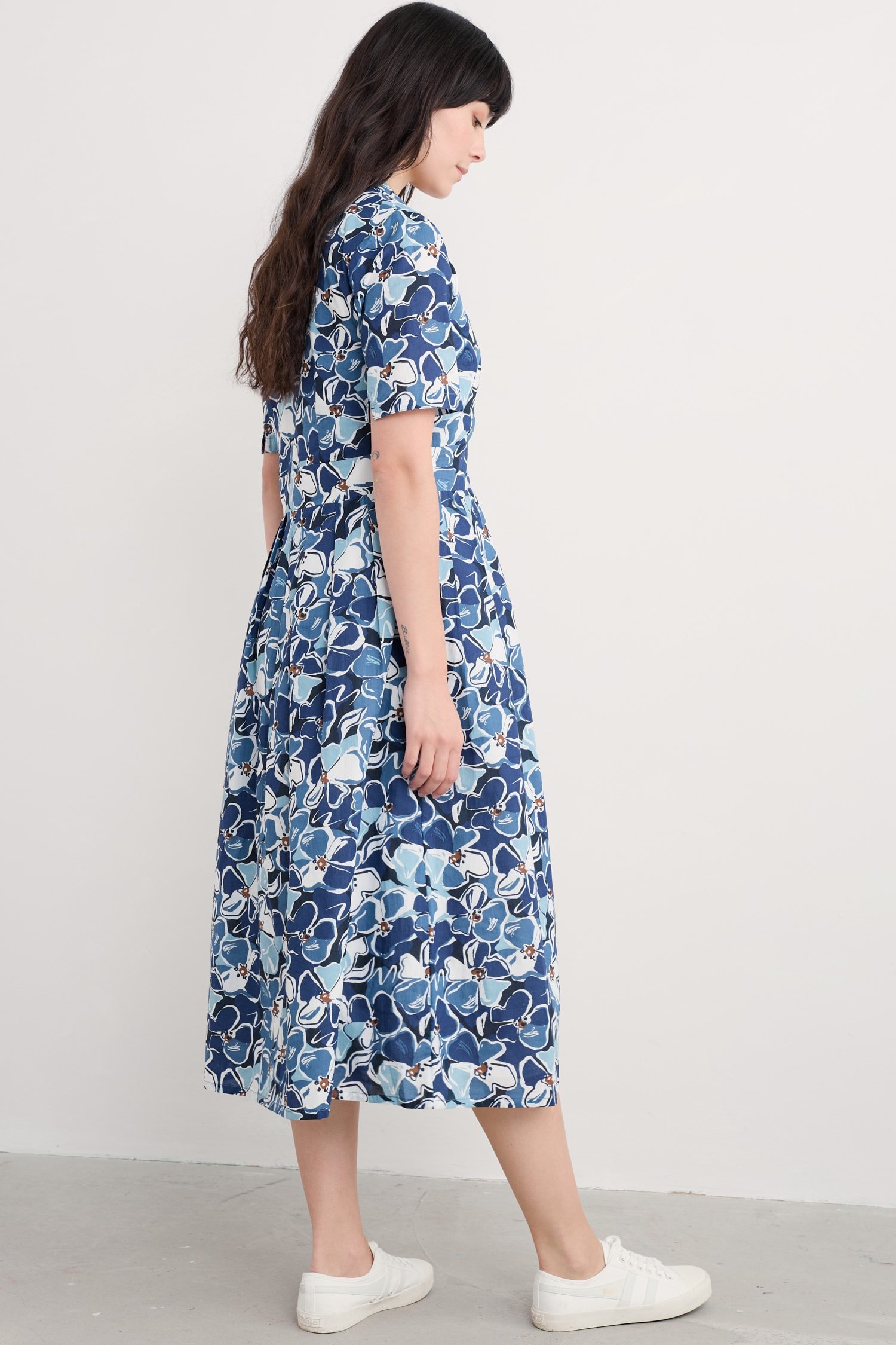 A midi-length shirt dress with an elegant vintage feel. Our Charlotte Dress is based on our best-selling Lottie, with a lower hem and half sleeves. Inspired by tea dresses from the forties and fifties, it’s made from soft cotton voile with a full skirt and buttons right through the front. It’s finished with piped trims, relaxed in seam pockets and a bold floral Seasalt print.